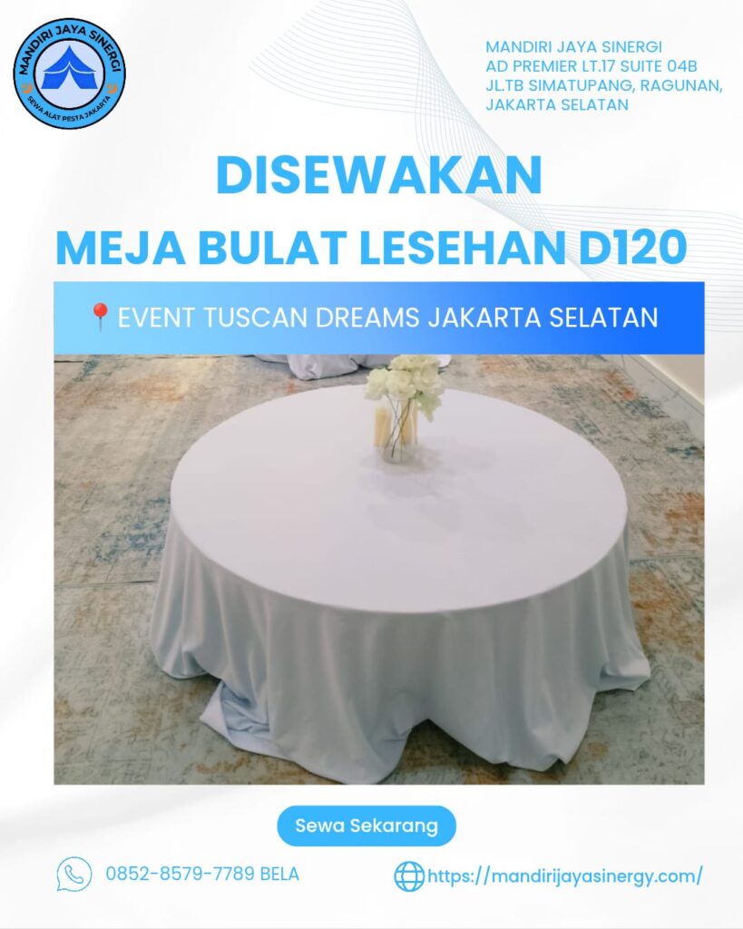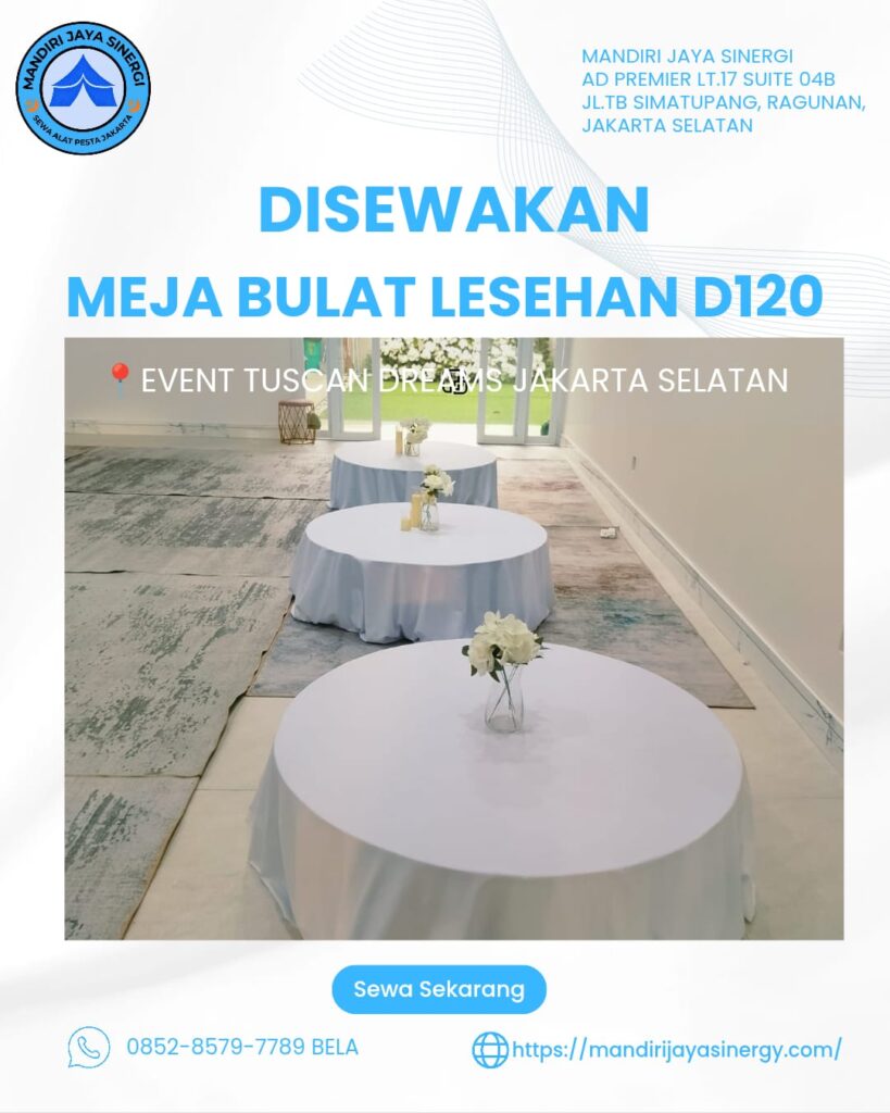 Jika anda sedang mencari layanan sewa meja bulat lesehan D120 yang terpercaya, Mandiri Jaya Sinergi siap menjadi partner terbaik untuk acara anda. Hubungi tim kami sekarang untuk mndapatkan informasi lengkap mengenai ketersediaan, harga sewa, dan perlengkapan event lainnya.